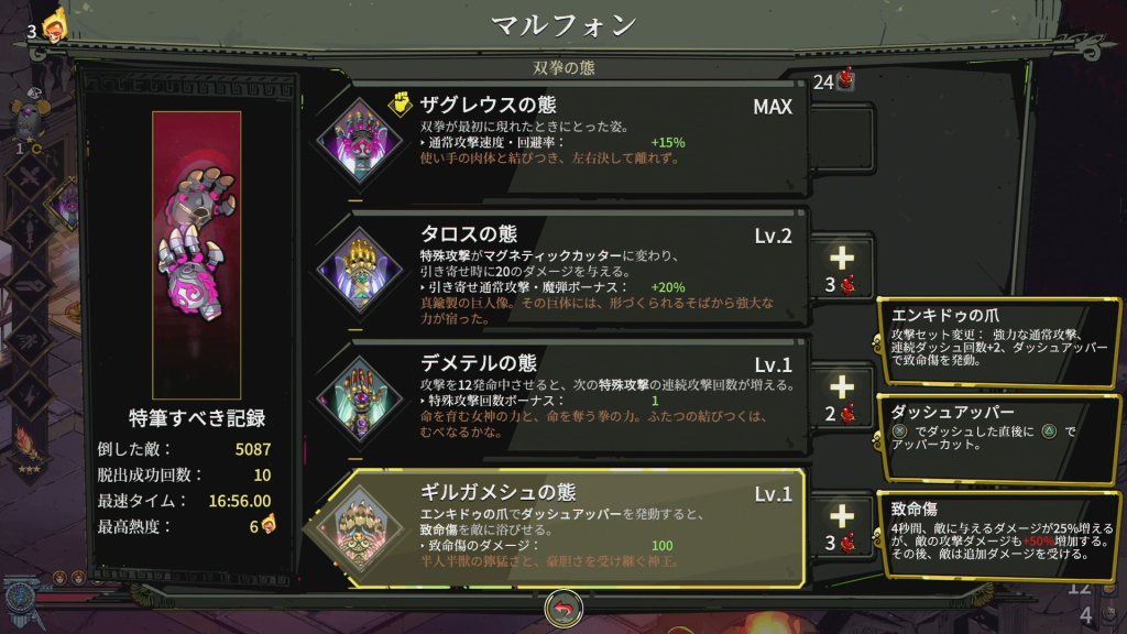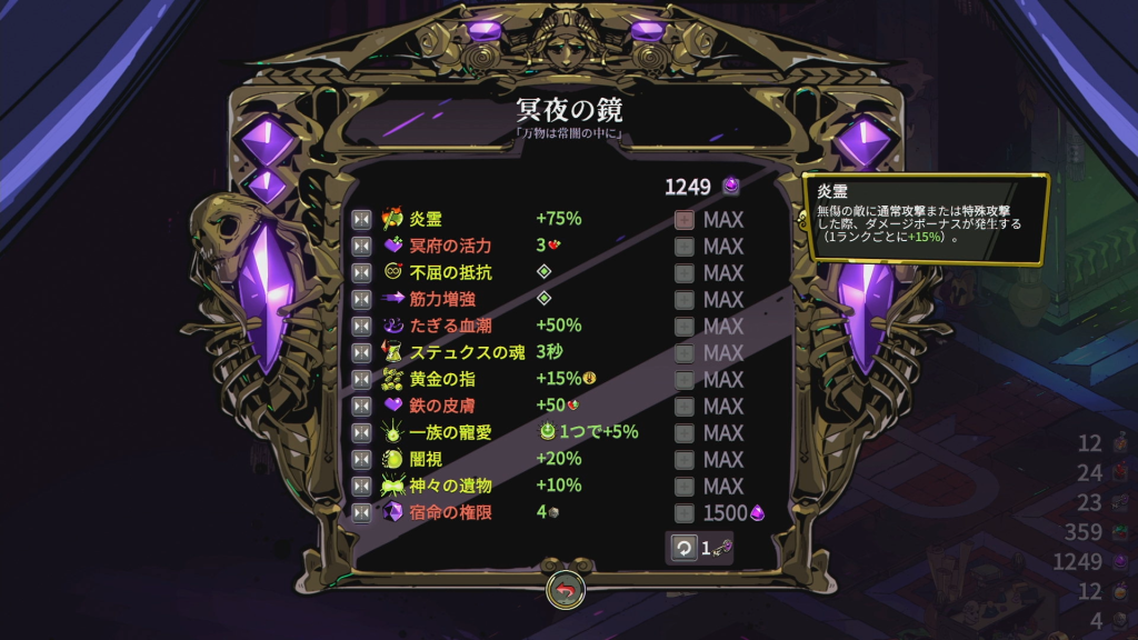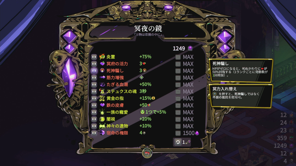 | 黄金の指 | 次の冥界エリア進行時、所持コイン +5%(最大3ランク / +15%) |