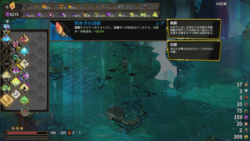 煌めきの羽根ランク3で「戦闘をすばやく終えるたびに、回避率と移動速度+1.2%になる」効果があり、だいたい17回達成すれば20%を超えます。
