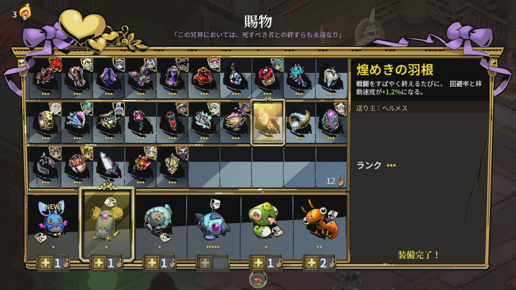 | 🏆 ヘルメスの俊足 | 煌めきの羽根を装備して、20%の回避率を得る |