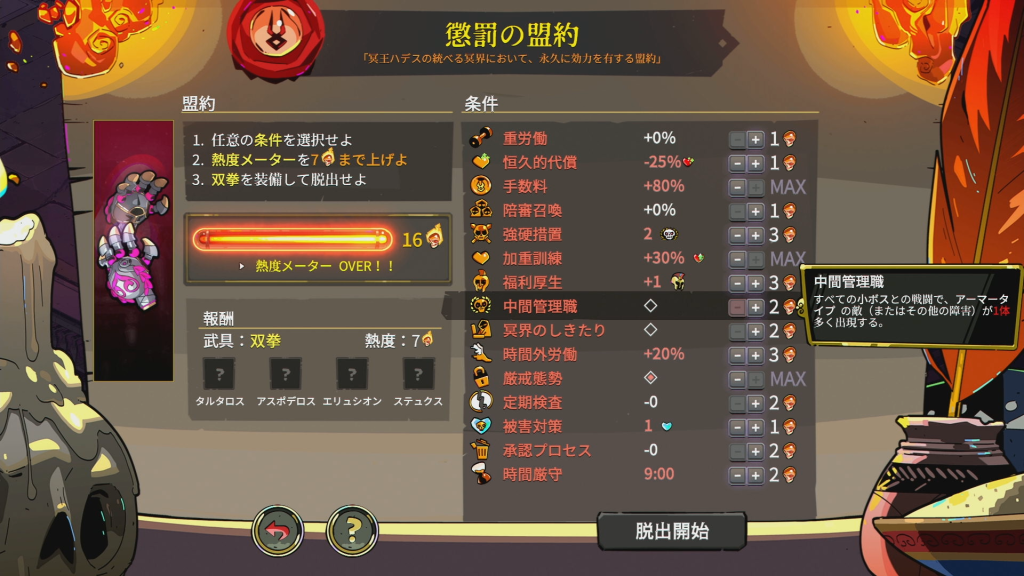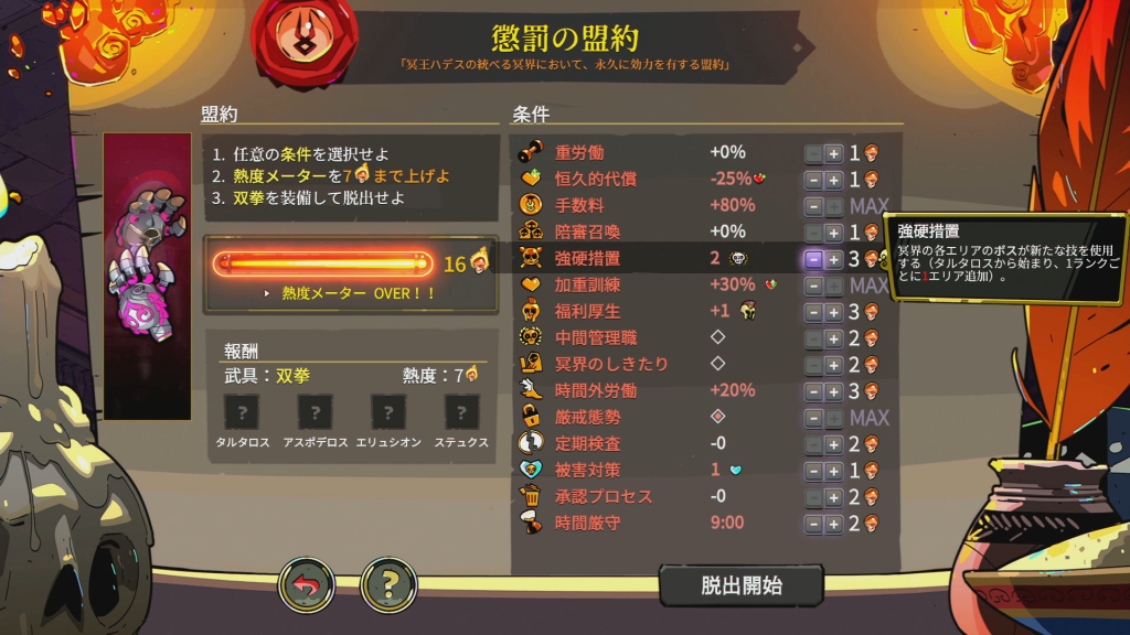| 熱度(ねつど) | クリア後に解放される「懲罰の盟約」で設定する難易度レベル。 |