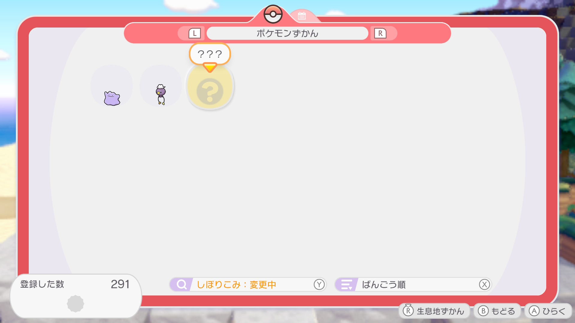 - ゆめしまに到着したら、Xボタン → ポケモン図鑑を開く