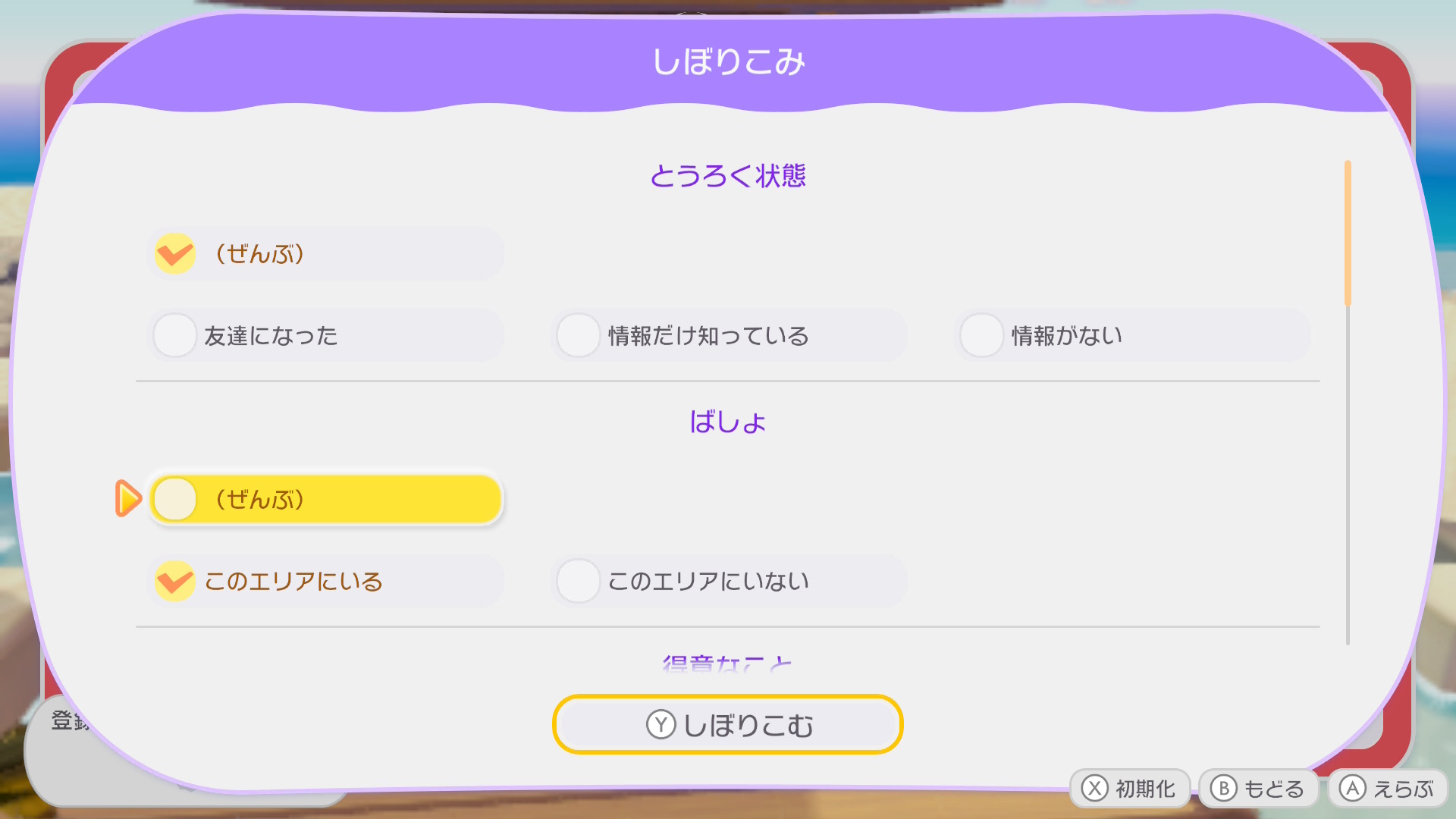 - 「とうろく情報:すべて」「場所:このエリアだけ」に切り替える。